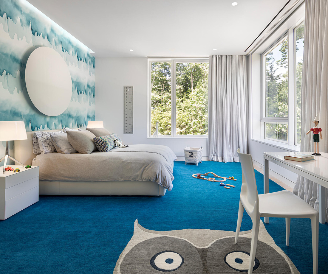 This modern new construction residence in Wellesley may be unassuming from the outside, but it bursts with color and personality inside. The key design challenge in this project was presented by the large plate glass windows dotting the exterior of the home.